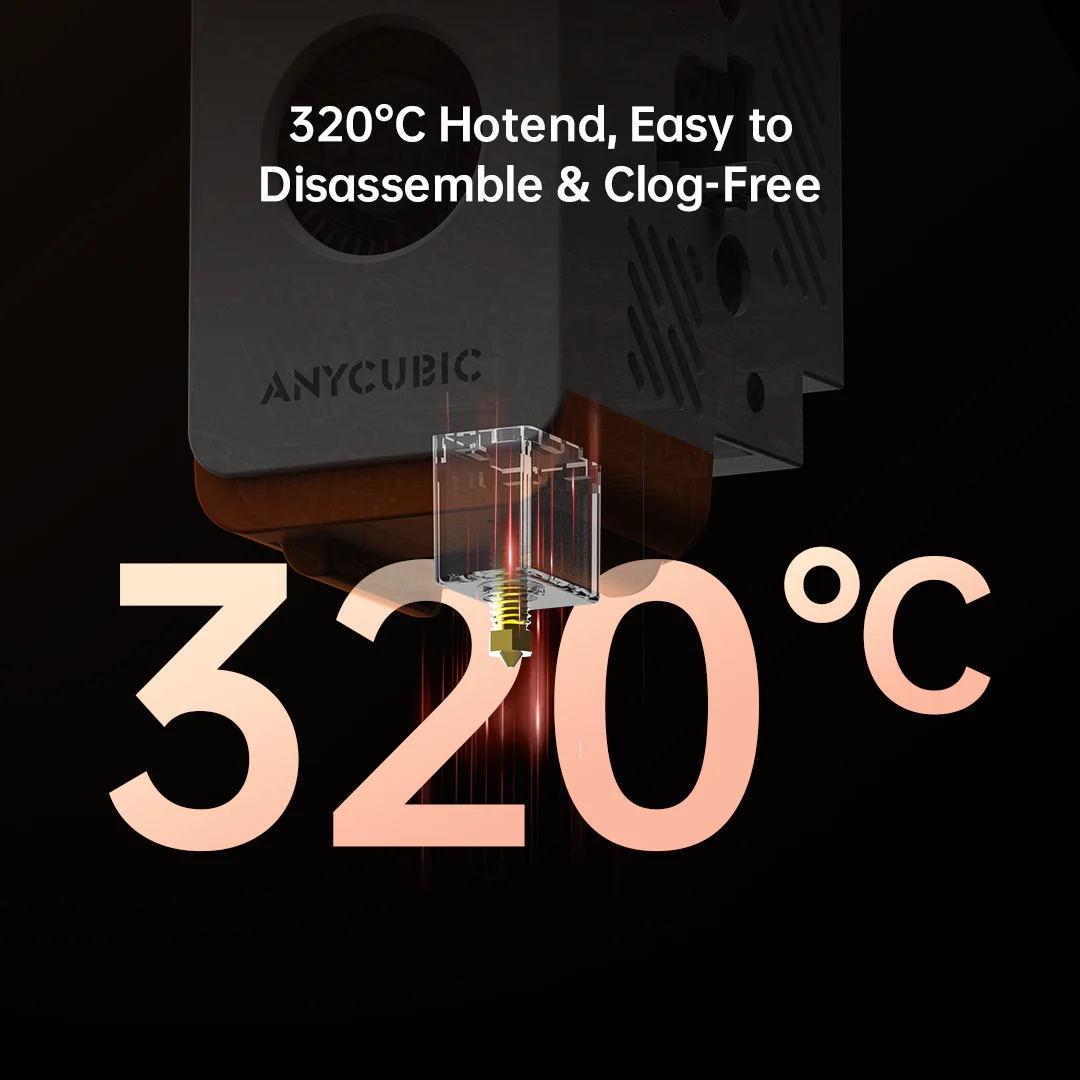 - 320°C All-Metal Hotend: Print high-performance materials like ABS, ASA, and Nylon without issues, supported by a heated printing plate up to 120°C. Features a tool-free quick-change design.